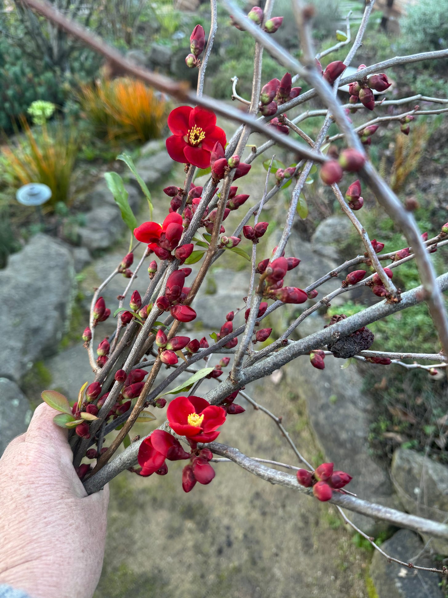 Ornamental quince, Hellebore, Camellia, long-blooming Salvias like ‘Waverly’ and ‘Amistad,’ late-winter blooming Ceanothus varieties such as ‘Ray Hartman’ and ‘Snowball,’ Rosemary, Manzanita
